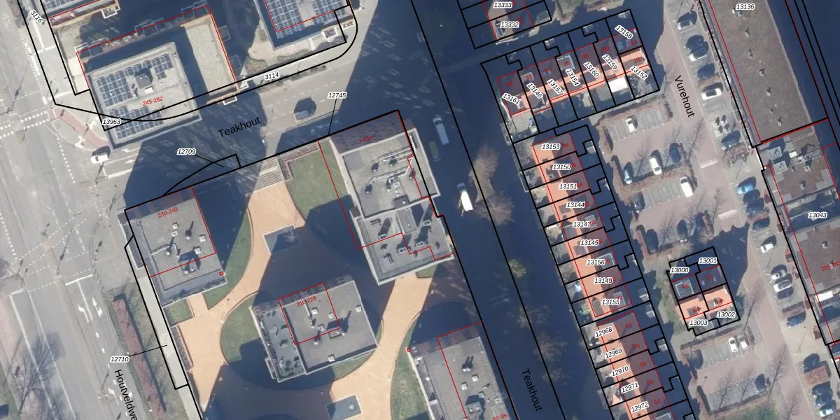 Het perceel waarop Teakhout 30 staat heeft een oppervlakte van 1,3 ha. Dit is een zeer groot perceel. De perceeloppervlakte wordt geregistreerd door het Kadaster. Gedetailleerde informatie over de maten van dit perceel kunt u vinden in het rapport Kadastrale kaart met maatvoering van Teakhout 30.