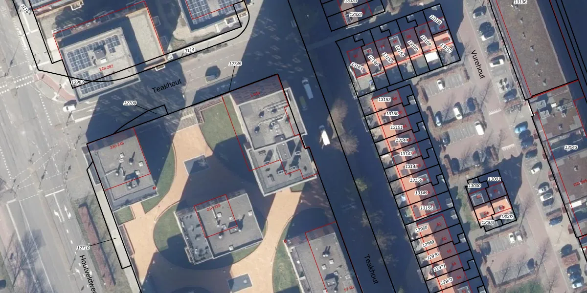 Het perceel waarop Teakhout 33-a staat heeft een oppervlakte van 1,3 ha. Dit is een zeer groot perceel. De perceeloppervlakte wordt geregistreerd door het Kadaster. Gedetailleerde informatie over de maten van dit perceel kunt u vinden in het rapport Kadastrale kaart met maatvoering van Teakhout 33-a.