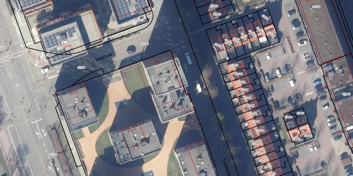 Het perceel waarop Teakhout 39-a staat heeft een oppervlakte van 1,3 ha. Dit is een zeer groot perceel. De perceeloppervlakte wordt geregistreerd door het Kadaster. Gedetailleerde informatie over de maten van dit perceel kunt u vinden in het rapport Kadastrale kaart met maatvoering van Teakhout 39-a.