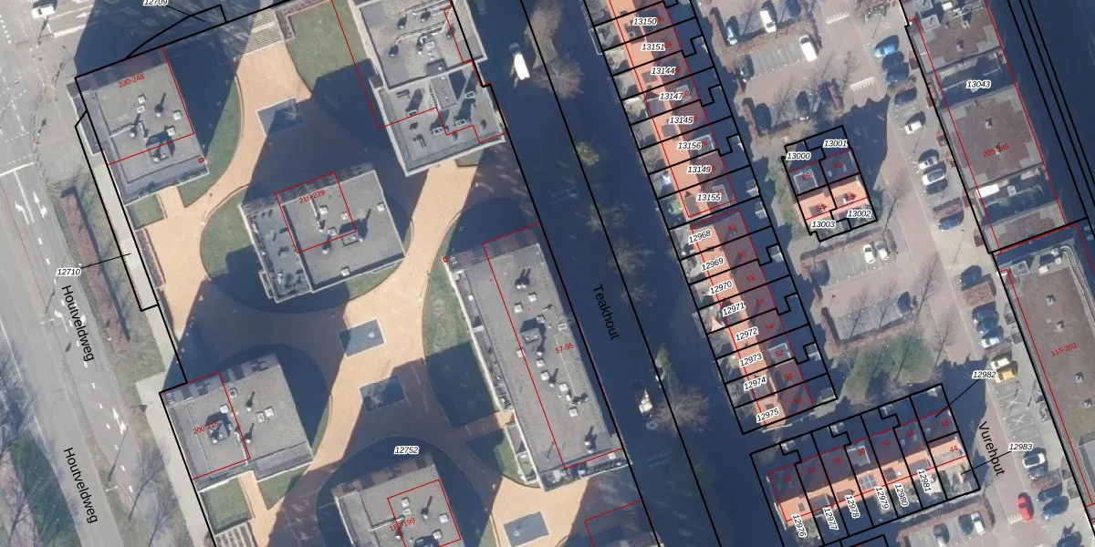 Het perceel waarop Teakhout 61 staat heeft een oppervlakte van 1,3 ha. Dit is een zeer groot perceel. De perceeloppervlakte wordt geregistreerd door het Kadaster. Gedetailleerde informatie over de maten van dit perceel kunt u vinden in het rapport Kadastrale kaart met maatvoering van Teakhout 61.
