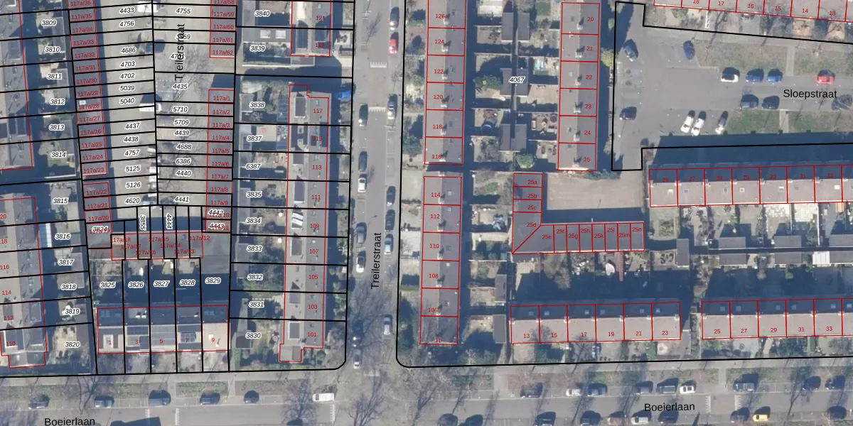 Treilerstraat 112 is gelegen op kadastraal perceel ZDM01L4067. Deze kadastrale aanduiding is uniek en wordt gebruikt door het Kadaster om eigendomsrechten en andere zakelijke rechten vast te leggen. Het perceel maakt onderdeel uit van de kadastrale gemeente Zaandam.