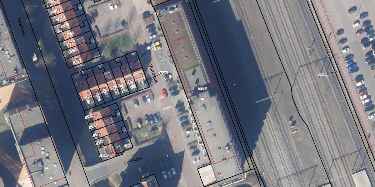 Het perceel waarop Vurehout 49 staat heeft een oppervlakte van 1940 m². Dit is een zeer groot perceel. De perceeloppervlakte wordt geregistreerd door het Kadaster. Gedetailleerde informatie over de maten van dit perceel kunt u vinden in het rapport Kadastrale kaart met maatvoering van Vurehout 49.