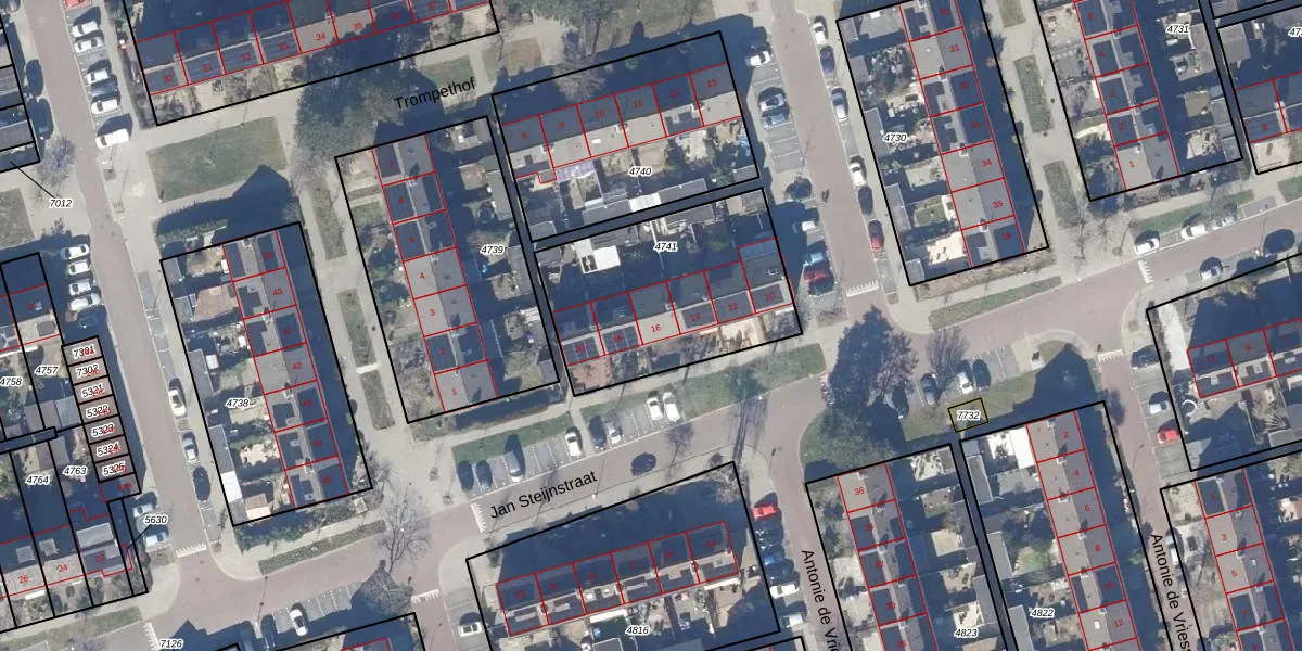 Het perceel waarop Jan Steijnstraat 16 staat heeft een oppervlakte van 838 m². Dit is een groot perceel. De perceeloppervlakte wordt geregistreerd door het Kadaster. Gedetailleerde informatie over de maten van dit perceel kunt u vinden in het rapport Kadastrale kaart met maatvoering van Jan Steijnstraat 16.