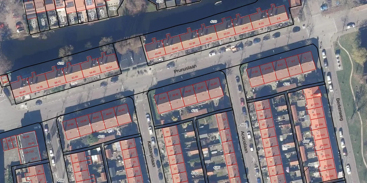 Het perceel waarop Prunuslaan 31 staat heeft een oppervlakte van 896 m². Dit is een groot perceel. De perceeloppervlakte wordt geregistreerd door het Kadaster. Gedetailleerde informatie over de maten van dit perceel kunt u vinden in het rapport Kadastrale kaart met maatvoering van Prunuslaan 31.