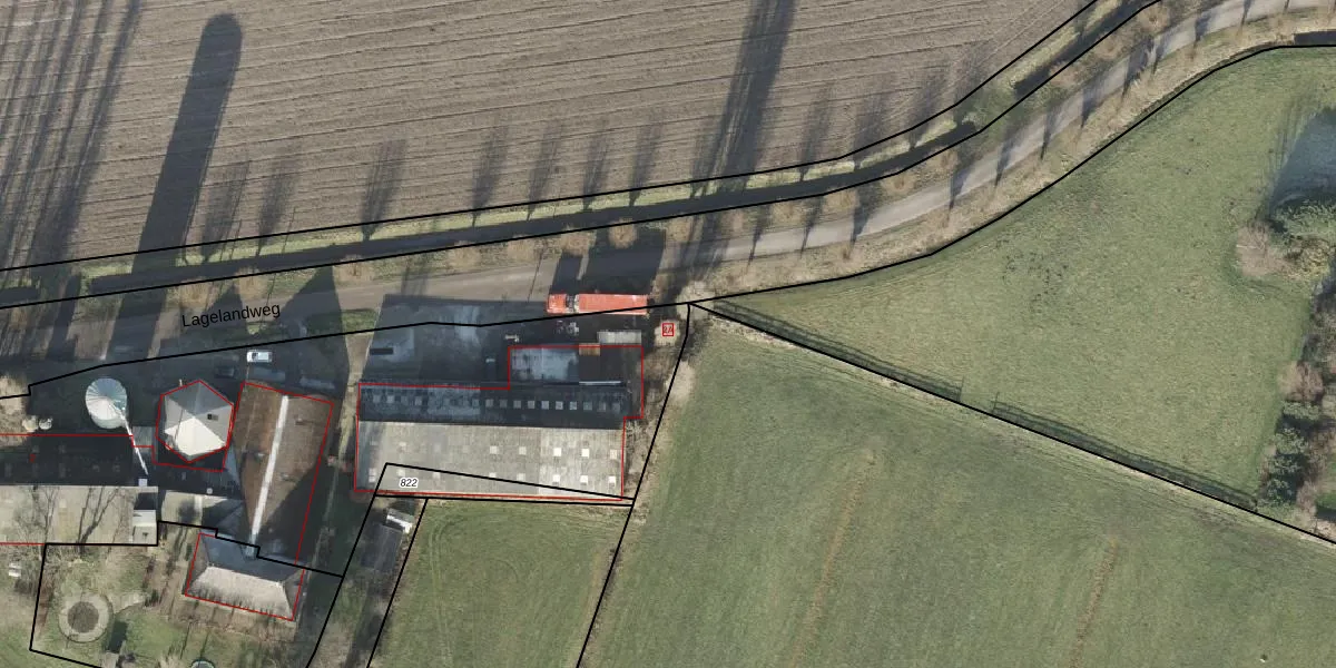 Het perceel waarop Lagelandweg 2-A staat heeft een oppervlakte van 4,8 ha. Dit is een zeer groot perceel. De perceeloppervlakte wordt geregistreerd door het Kadaster. Gedetailleerde informatie over de maten van dit perceel kunt u vinden in het rapport Kadastrale kaart met maatvoering van Lagelandweg 2-A.