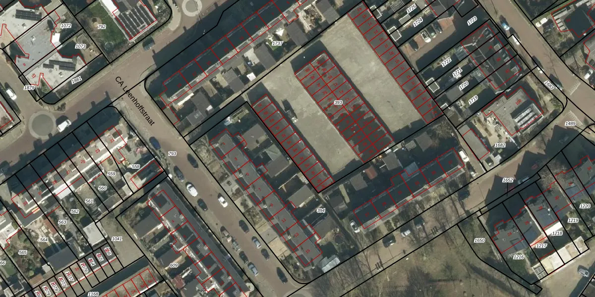 Het perceel waarop CA Leenhoffstraat 3-w staat heeft een oppervlakte van 2375 m². Dit is een zeer groot perceel. De perceeloppervlakte wordt geregistreerd door het Kadaster. Gedetailleerde informatie over de maten van dit perceel kunt u vinden in het rapport Kadastrale kaart met maatvoering van CA Leenhoffstraat 3-w.