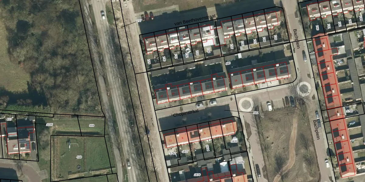 Het perceel waarop Chopinstraat 8 staat heeft een oppervlakte van 1720 m². Dit is een zeer groot perceel. De perceeloppervlakte wordt geregistreerd door het Kadaster. Gedetailleerde informatie over de maten van dit perceel kunt u vinden in het rapport Kadastrale kaart met maatvoering van Chopinstraat 8.