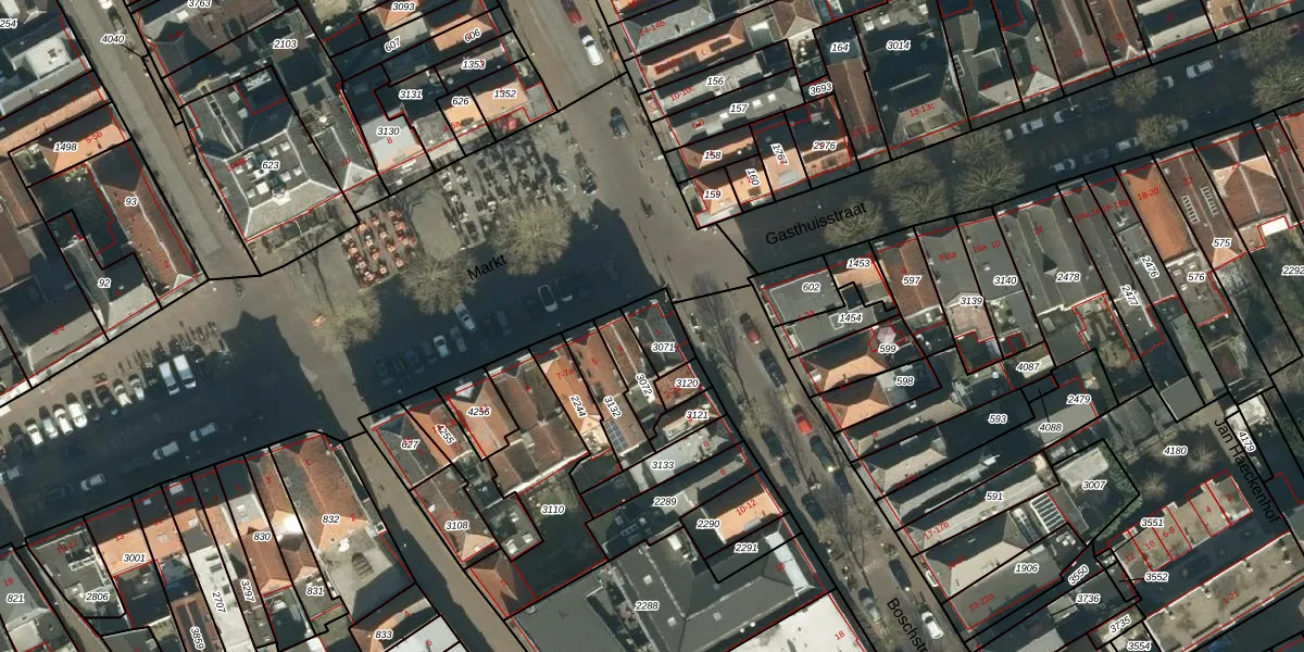 Het perceel waarop Markt 1 staat heeft een oppervlakte van 84 m². Dit is een klein perceel. De perceeloppervlakte wordt geregistreerd door het Kadaster. Gedetailleerde informatie over de maten van dit perceel kunt u vinden in het rapport Kadastrale kaart met maatvoering van Markt 1.