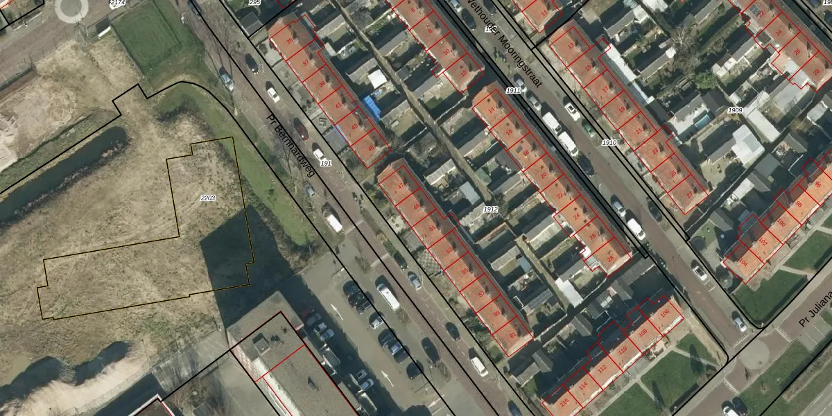 Het perceel waarop Pr Bernhardweg 49 staat heeft een oppervlakte van 5856 m². Dit is een zeer groot perceel. De perceeloppervlakte wordt geregistreerd door het Kadaster. Gedetailleerde informatie over de maten van dit perceel kunt u vinden in het rapport Kadastrale kaart met maatvoering van Pr Bernhardweg 49.