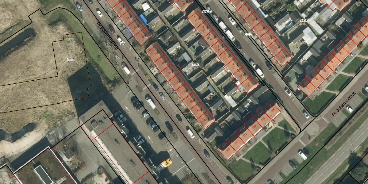 Het perceel waarop Pr Bernhardweg 55 staat heeft een oppervlakte van 5856 m². Dit is een zeer groot perceel. De perceeloppervlakte wordt geregistreerd door het Kadaster. Gedetailleerde informatie over de maten van dit perceel kunt u vinden in het rapport Kadastrale kaart met maatvoering van Pr Bernhardweg 55.