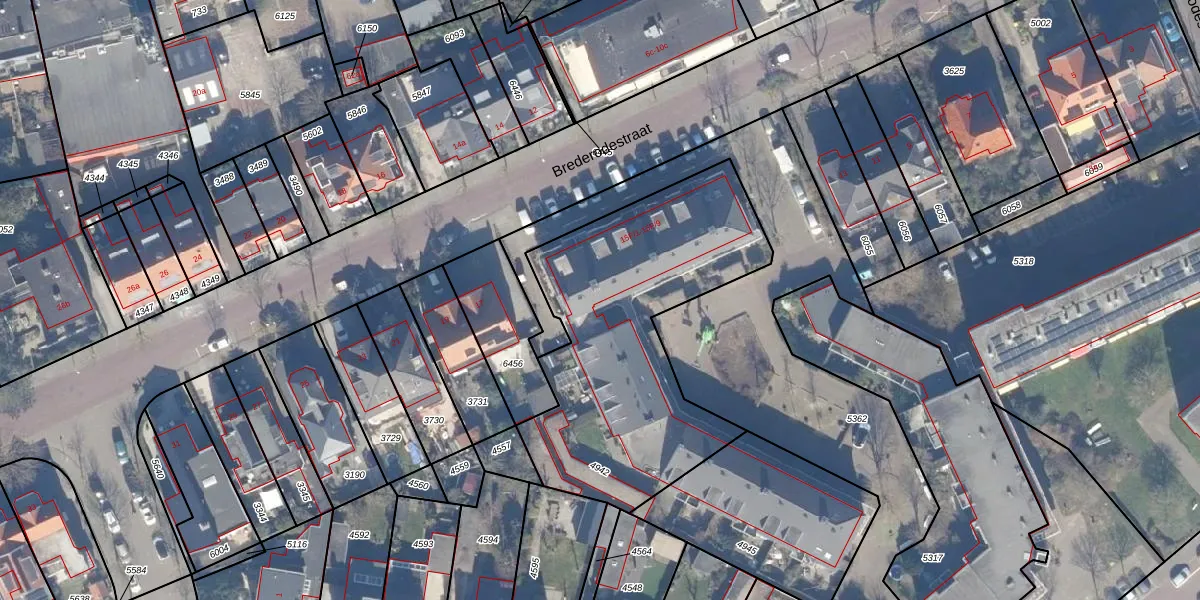 Het perceel waarop Brederodestraat 15-F-12 staat heeft een oppervlakte van 1390 m². Dit is een zeer groot perceel. De perceeloppervlakte wordt geregistreerd door het Kadaster. Gedetailleerde informatie over de maten van dit perceel kunt u vinden in het rapport Kadastrale kaart met maatvoering van Brederodestraat 15-F-12.