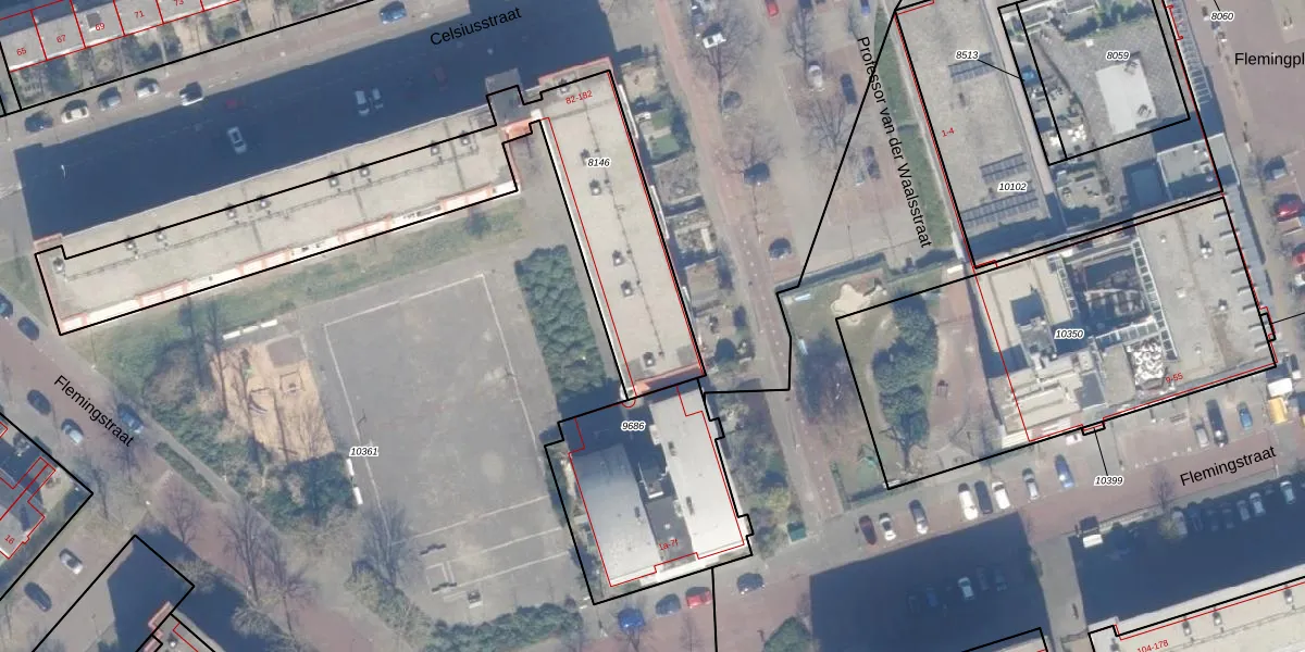 Het perceel waarop Celsiusstraat 104 staat heeft een oppervlakte van 1569 m². Dit is een zeer groot perceel. De perceeloppervlakte wordt geregistreerd door het Kadaster. Gedetailleerde informatie over de maten van dit perceel kunt u vinden in het rapport Kadastrale kaart met maatvoering van Celsiusstraat 104.