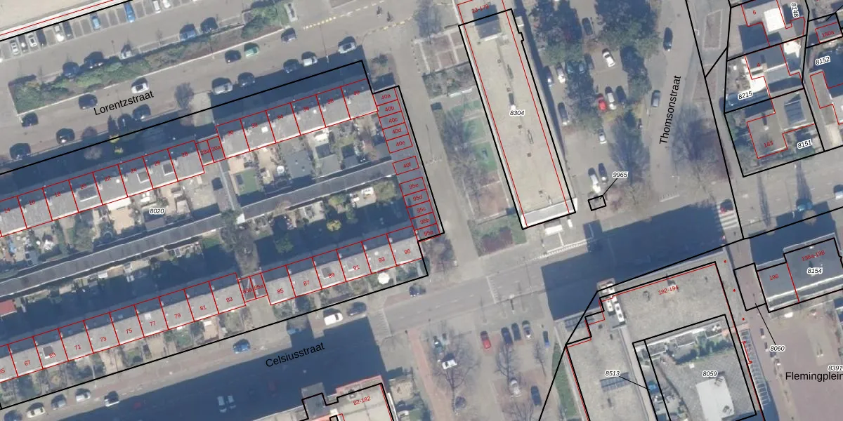 Het perceel waarop Celsiusstraat 95-c staat heeft een oppervlakte van 5910 m². Dit is een zeer groot perceel. De perceeloppervlakte wordt geregistreerd door het Kadaster. Gedetailleerde informatie over de maten van dit perceel kunt u vinden in het rapport Kadastrale kaart met maatvoering van Celsiusstraat 95-c.