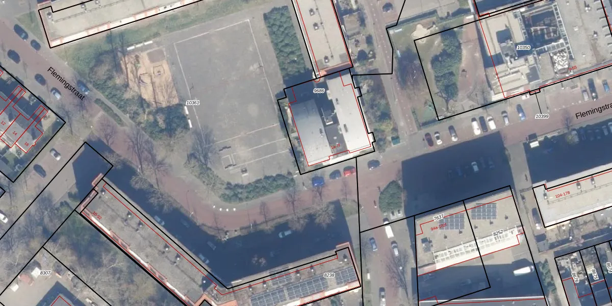 Het perceel waarop Flemingstraat 1-b staat heeft een oppervlakte van 727 m². Dit is een groot perceel. De perceeloppervlakte wordt geregistreerd door het Kadaster. Gedetailleerde informatie over de maten van dit perceel kunt u vinden in het rapport Kadastrale kaart met maatvoering van Flemingstraat 1-b.