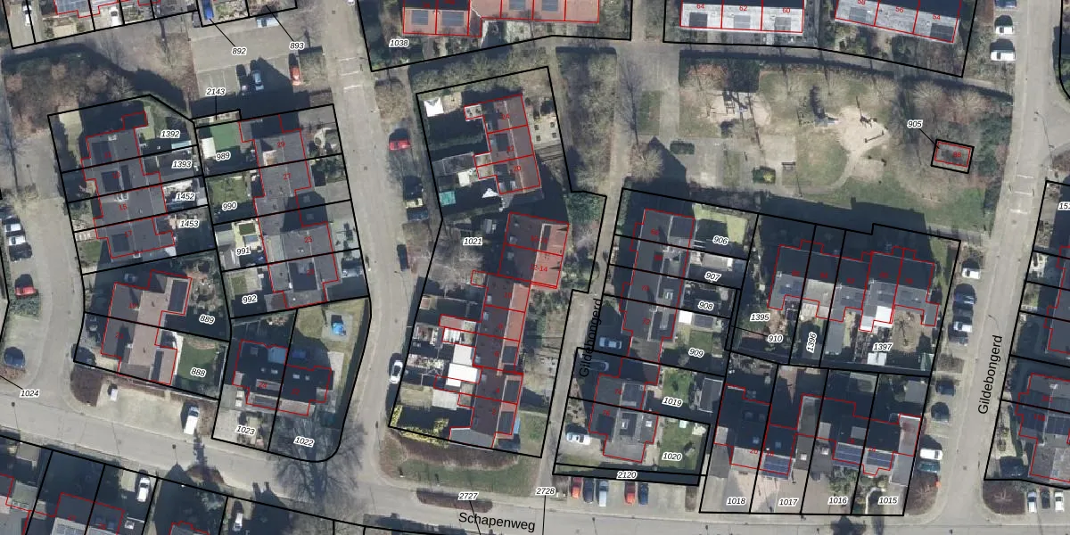 Het perceel waarop Gildebongerd 12 staat heeft een oppervlakte van 1930 m². Dit is een zeer groot perceel. De perceeloppervlakte wordt geregistreerd door het Kadaster. Gedetailleerde informatie over de maten van dit perceel kunt u vinden in het rapport Kadastrale kaart met maatvoering van Gildebongerd 12.