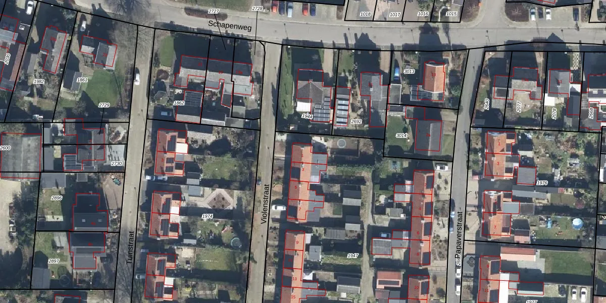 Het perceel waarop Violenstraat 1 staat heeft een oppervlakte van 4560 m². Dit is een zeer groot perceel. De perceeloppervlakte wordt geregistreerd door het Kadaster. Gedetailleerde informatie over de maten van dit perceel kunt u vinden in het rapport Kadastrale kaart met maatvoering van Violenstraat 1.