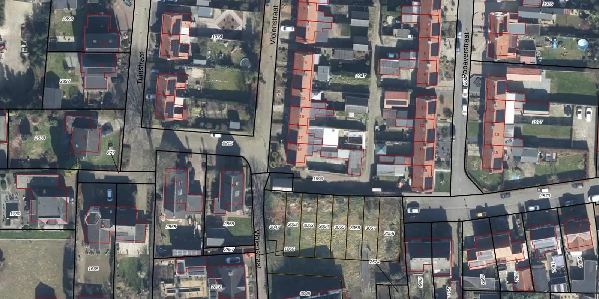 Het perceel waarop Violenstraat 19 staat heeft een oppervlakte van 4560 m². Dit is een zeer groot perceel. De perceeloppervlakte wordt geregistreerd door het Kadaster. Gedetailleerde informatie over de maten van dit perceel kunt u vinden in het rapport Kadastrale kaart met maatvoering van Violenstraat 19.