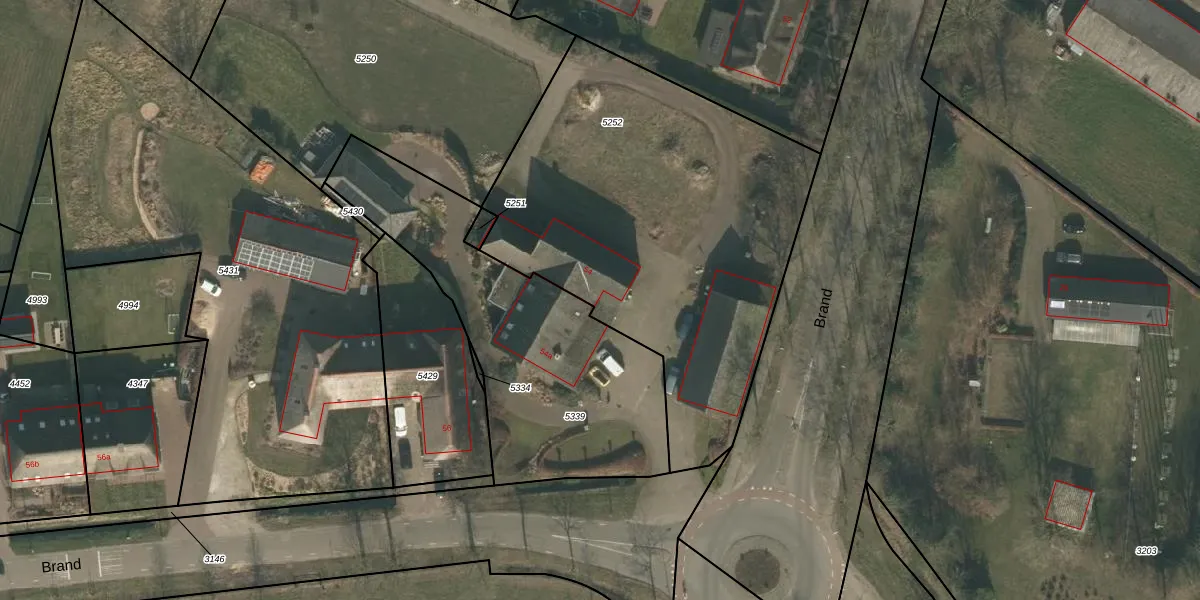 Het perceel waarop Brand 54 staat heeft een oppervlakte van 2160 m². Dit is een zeer groot perceel. De perceeloppervlakte wordt geregistreerd door het Kadaster. Gedetailleerde informatie over de maten van dit perceel kunt u vinden in het rapport Kadastrale kaart met maatvoering van Brand 54.