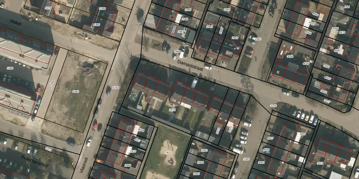 Het perceel waarop Damaststraat 8 staat heeft een oppervlakte van 1574 m². Dit is een zeer groot perceel. De perceeloppervlakte wordt geregistreerd door het Kadaster. Gedetailleerde informatie over de maten van dit perceel kunt u vinden in het rapport Kadastrale kaart met maatvoering van Damaststraat 8.