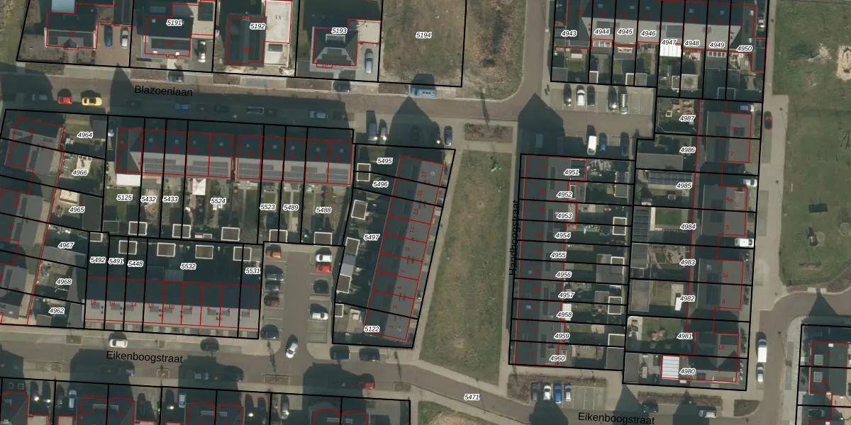 Handboogstraat 13 is gelegen op kadastraal perceel ZLD02H5497. Deze kadastrale aanduiding is uniek en wordt gebruikt door het Kadaster om eigendomsrechten en andere zakelijke rechten vast te leggen. Het perceel maakt onderdeel uit van de kadastrale gemeente Zeeland.