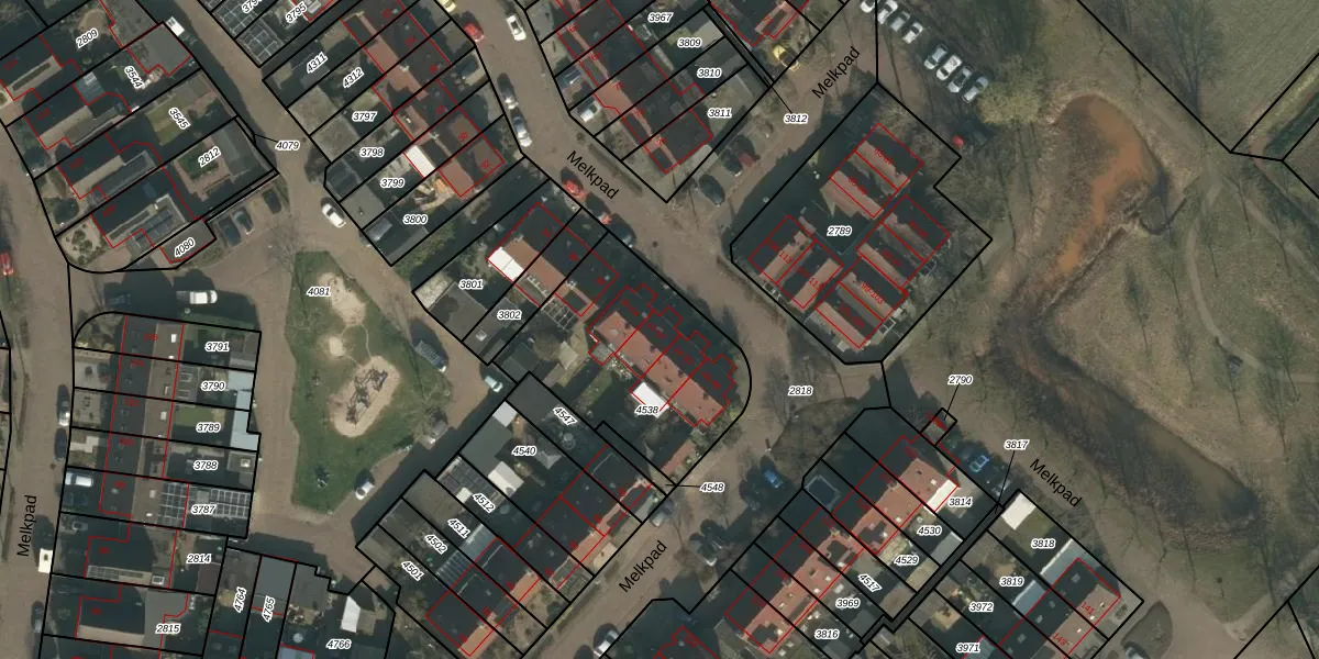 Het perceel waarop Melkpad 42 staat heeft een oppervlakte van 773 m². Dit is een groot perceel. De perceeloppervlakte wordt geregistreerd door het Kadaster. Gedetailleerde informatie over de maten van dit perceel kunt u vinden in het rapport Kadastrale kaart met maatvoering van Melkpad 42.