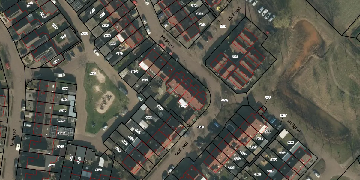 Het perceel waarop Melkpad 52 staat heeft een oppervlakte van 773 m². Dit is een groot perceel. De perceeloppervlakte wordt geregistreerd door het Kadaster. Gedetailleerde informatie over de maten van dit perceel kunt u vinden in het rapport Kadastrale kaart met maatvoering van Melkpad 52.