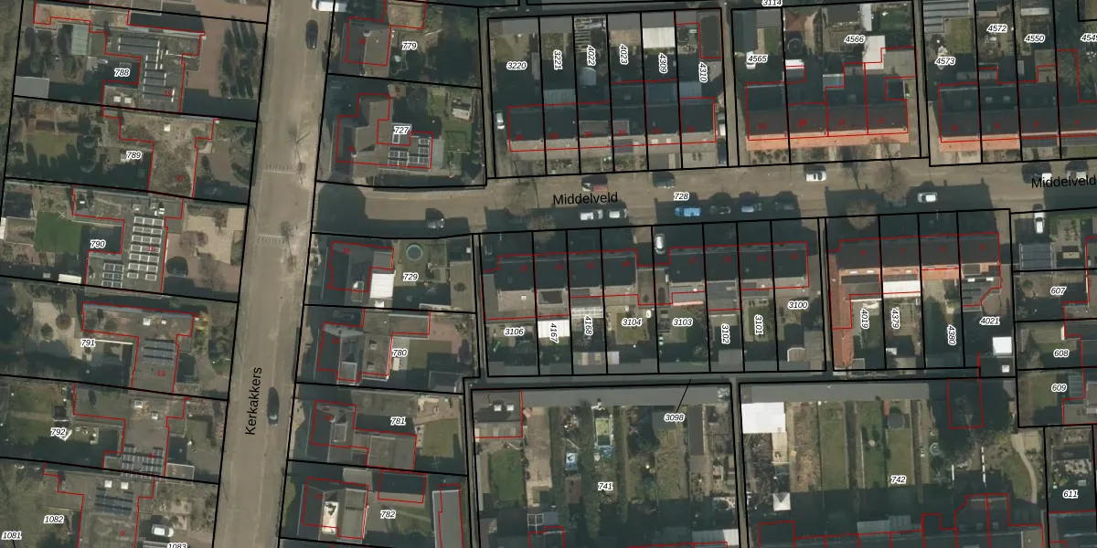 Het perceel waarop Middelveld 23 staat heeft een oppervlakte van 163 m². Dit is een middelgroot perceel. De perceeloppervlakte wordt geregistreerd door het Kadaster. Gedetailleerde informatie over de maten van dit perceel kunt u vinden in het rapport Kadastrale kaart met maatvoering van Middelveld 23.