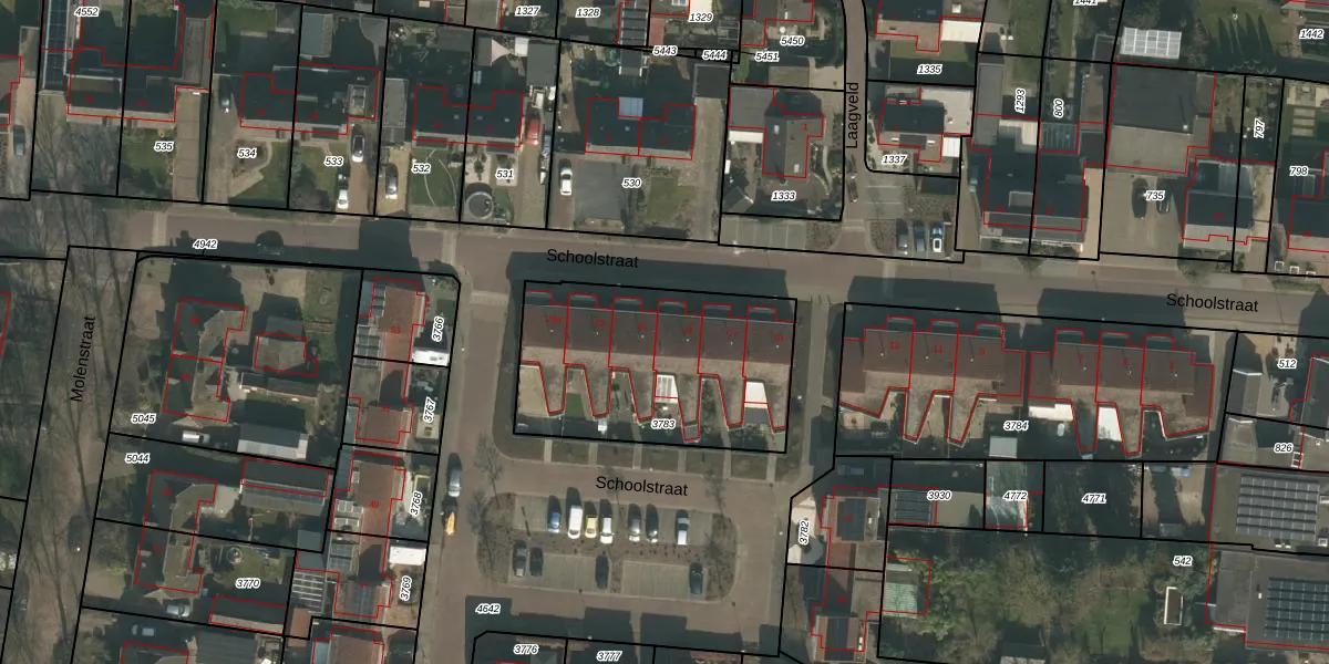 Het perceel waarop Schoolstraat 19 staat heeft een oppervlakte van 956 m². Dit is een groot perceel. De perceeloppervlakte wordt geregistreerd door het Kadaster. Gedetailleerde informatie over de maten van dit perceel kunt u vinden in het rapport Kadastrale kaart met maatvoering van Schoolstraat 19.