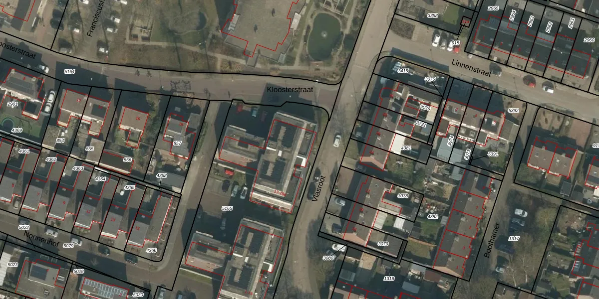 Het perceel waarop Vlasroot 25 staat heeft een oppervlakte van 2494 m². Dit is een zeer groot perceel. De perceeloppervlakte wordt geregistreerd door het Kadaster. Gedetailleerde informatie over de maten van dit perceel kunt u vinden in het rapport Kadastrale kaart met maatvoering van Vlasroot 25.