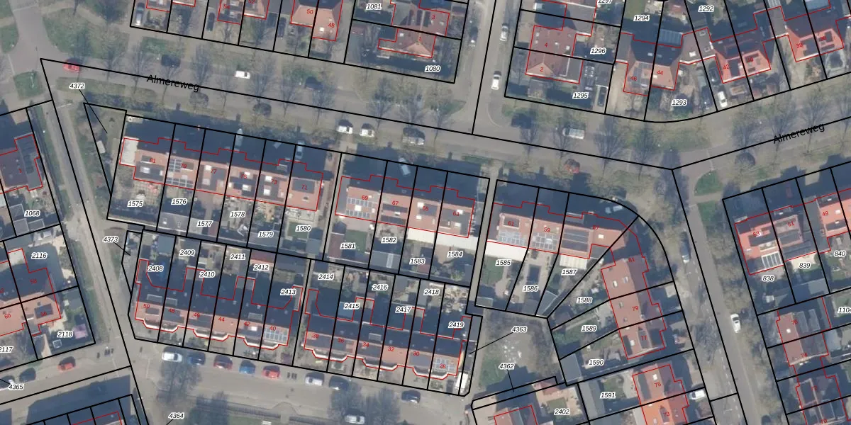 Het perceel waarop Almereweg 65 staat heeft een oppervlakte van 187 m². Dit is een middelgroot perceel. De perceeloppervlakte wordt geregistreerd door het Kadaster. Gedetailleerde informatie over de maten van dit perceel kunt u vinden in het rapport Kadastrale kaart met maatvoering van Almereweg 65.