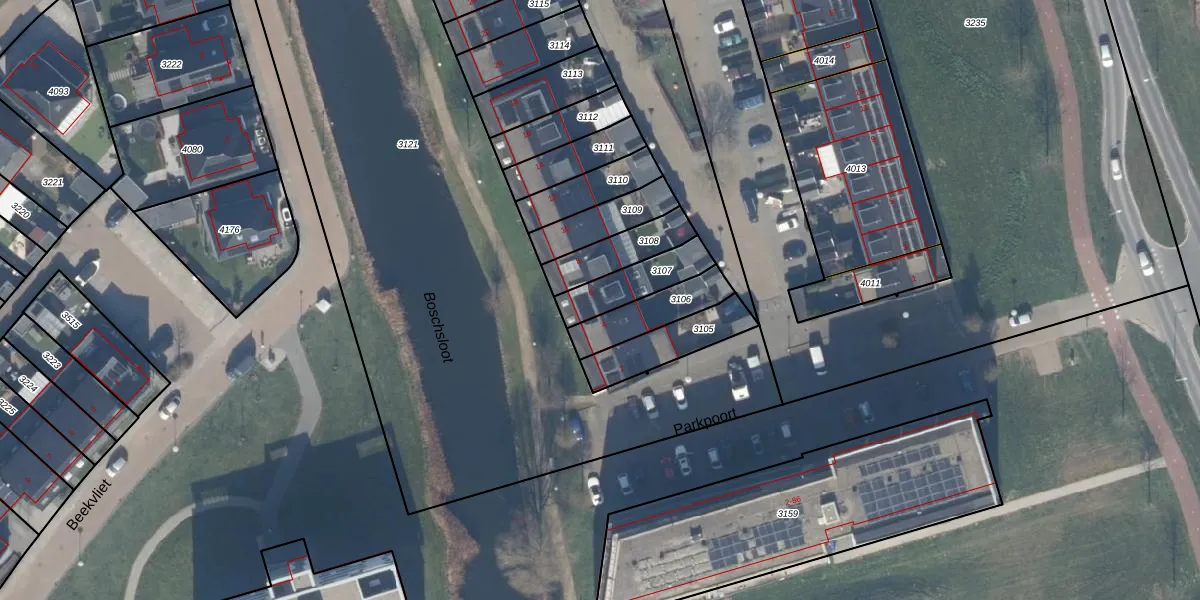 Het adres is gelegen op perceel 3107 in de sectie E en de kadastrale gemeente Zeewolde. De kadastrale aanduiding is aldus ZWD03-E-3107. Het perceel is 152 m² groot. Dat is kleiner dan de gemiddelde perceeloppervlakte in Zeewolde, dat op 1,9 ha ligt. Het grootste perceel in de kadastrale gemeente is 6,16 km². Het kleinste perceel heeft een oppervlakte van 0 m². Er zijn geen andere adressen aanwezig op het perceel. De huidige grenzen van het perceel zijn digitaal in de Basisregistratie Kadaster (BRK) geregistreerd op 07-11-2011.