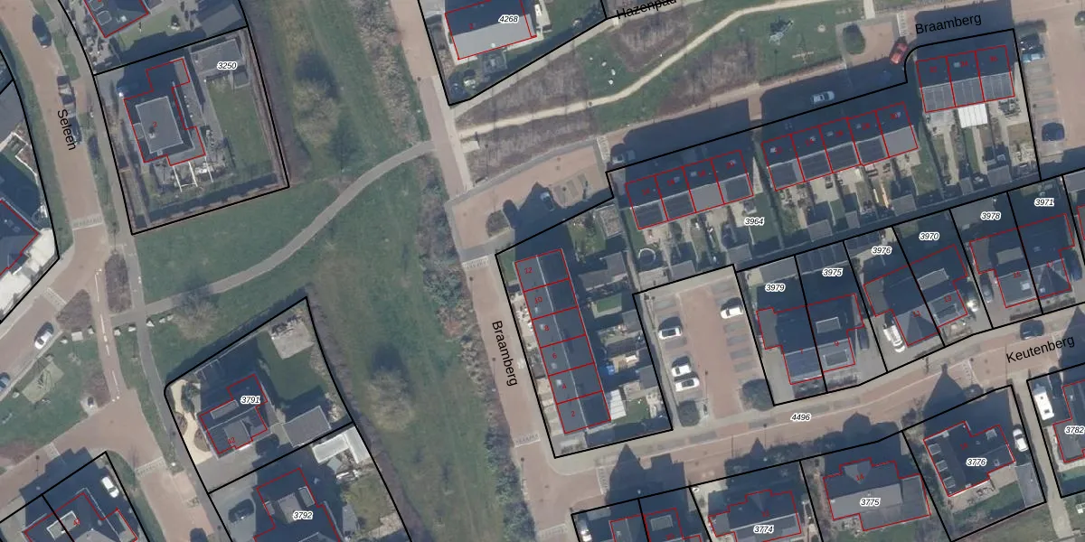 Het perceel waarop Braamberg 12 staat heeft een oppervlakte van 2935 m². Dit is een zeer groot perceel. De perceeloppervlakte wordt geregistreerd door het Kadaster. Gedetailleerde informatie over de maten van dit perceel kunt u vinden in het rapport Kadastrale kaart met maatvoering van Braamberg 12.