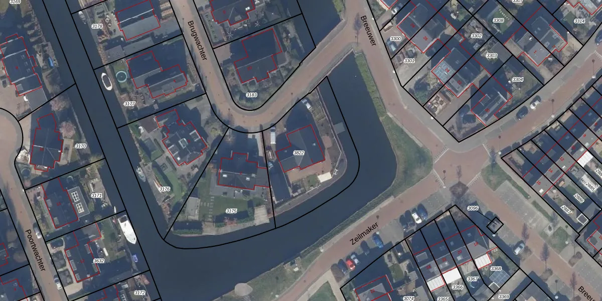 Het perceel waarop Brugwachter 1 staat heeft een oppervlakte van 995 m². Dit is een groot perceel. De perceeloppervlakte wordt geregistreerd door het Kadaster. Gedetailleerde informatie over de maten van dit perceel kunt u vinden in het rapport Kadastrale kaart met maatvoering van Brugwachter 1.