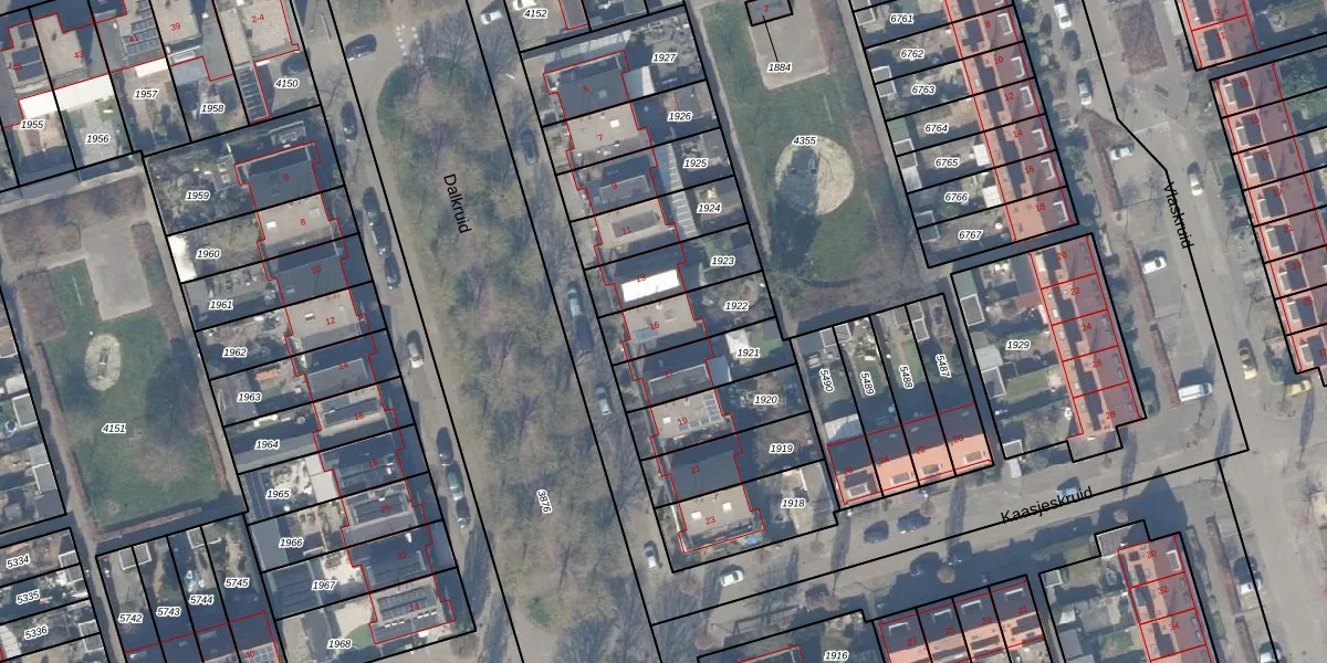 Het perceel waarop Dalkruid 15 staat heeft een oppervlakte van 193 m². Dit is een middelgroot perceel. De perceeloppervlakte wordt geregistreerd door het Kadaster. Gedetailleerde informatie over de maten van dit perceel kunt u vinden in het rapport Kadastrale kaart met maatvoering van Dalkruid 15.