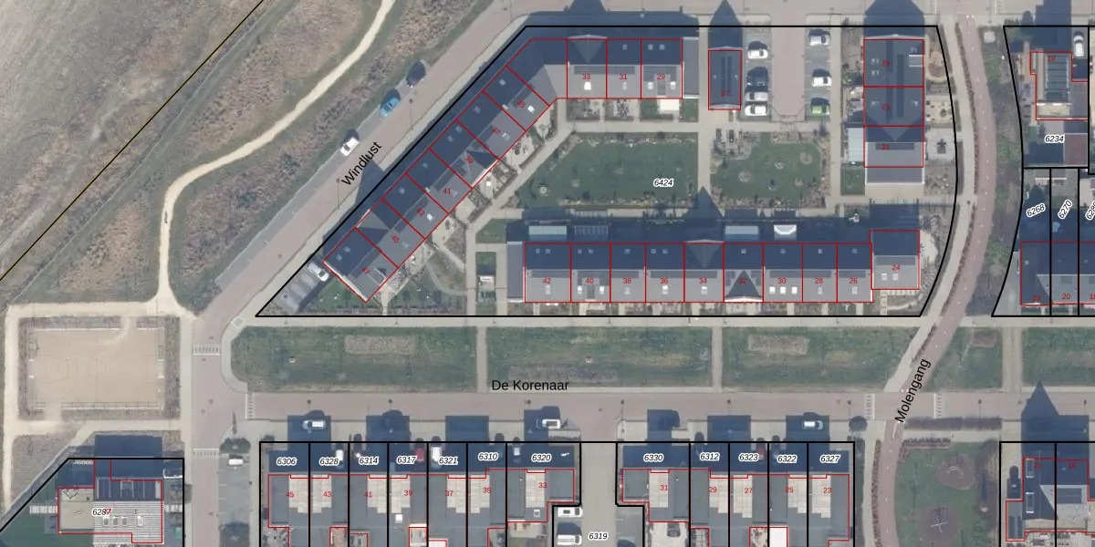 Het perceel waarop De Korenaar 42 staat heeft een oppervlakte van 5385 m². Dit is een zeer groot perceel. De perceeloppervlakte wordt geregistreerd door het Kadaster. Gedetailleerde informatie over de maten van dit perceel kunt u vinden in het rapport Kadastrale kaart met maatvoering van De Korenaar 42.