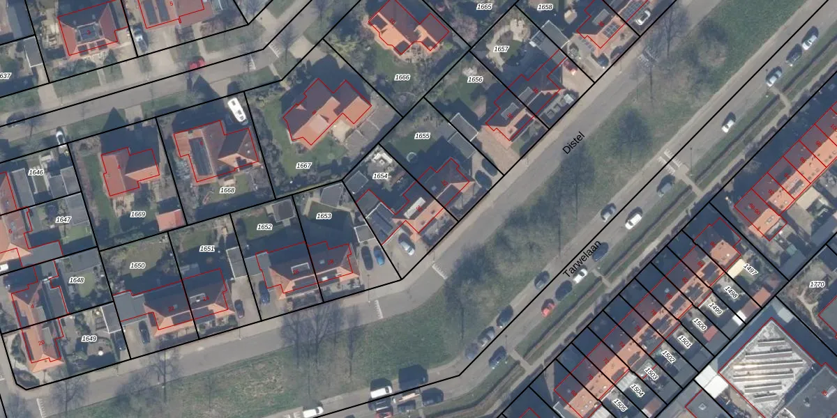 Het perceel waarop Distel 30 staat heeft een oppervlakte van 429 m². Dit is een groot perceel. De perceeloppervlakte wordt geregistreerd door het Kadaster. Gedetailleerde informatie over de maten van dit perceel kunt u vinden in het rapport Kadastrale kaart met maatvoering van Distel 30.