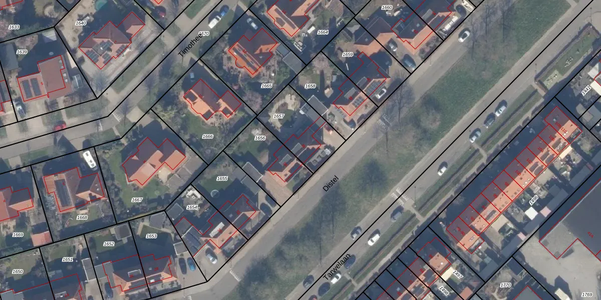 Het perceel waarop Distel 36 staat heeft een oppervlakte van 417 m². Dit is een groot perceel. De perceeloppervlakte wordt geregistreerd door het Kadaster. Gedetailleerde informatie over de maten van dit perceel kunt u vinden in het rapport Kadastrale kaart met maatvoering van Distel 36.
