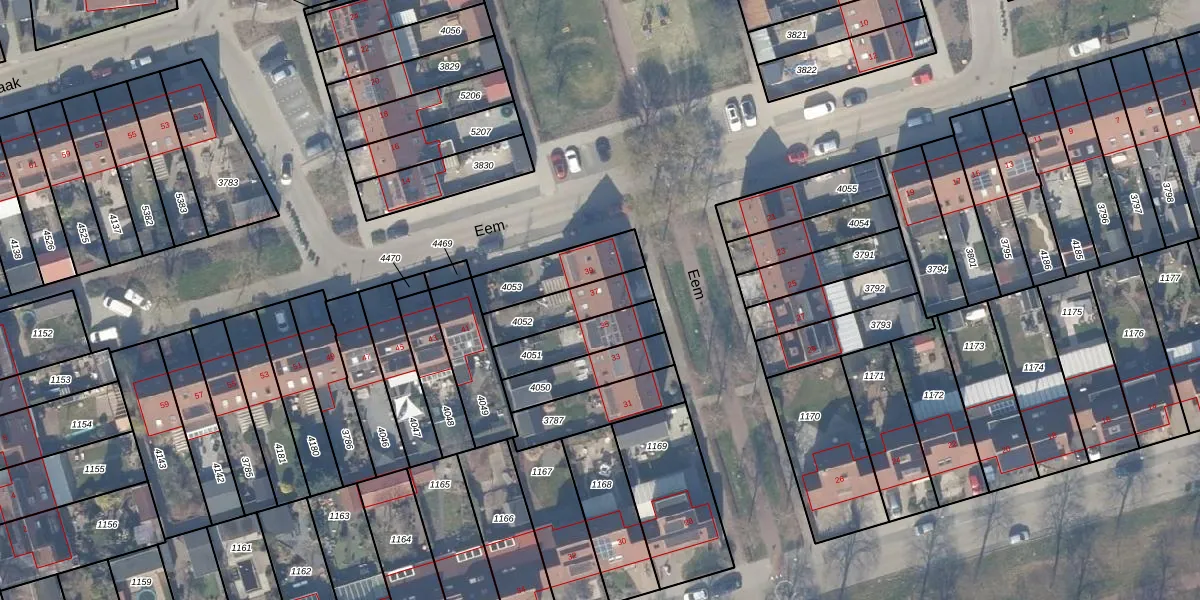 Het perceel waarop Eem 37 staat heeft een oppervlakte van 162 m². Dit is een middelgroot perceel. De perceeloppervlakte wordt geregistreerd door het Kadaster. Gedetailleerde informatie over de maten van dit perceel kunt u vinden in het rapport Kadastrale kaart met maatvoering van Eem 37.