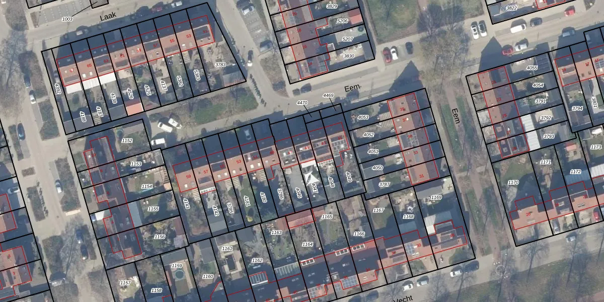 Het perceel waarop Eem 45 staat heeft een oppervlakte van 174 m². Dit is een middelgroot perceel. De perceeloppervlakte wordt geregistreerd door het Kadaster. Gedetailleerde informatie over de maten van dit perceel kunt u vinden in het rapport Kadastrale kaart met maatvoering van Eem 45.