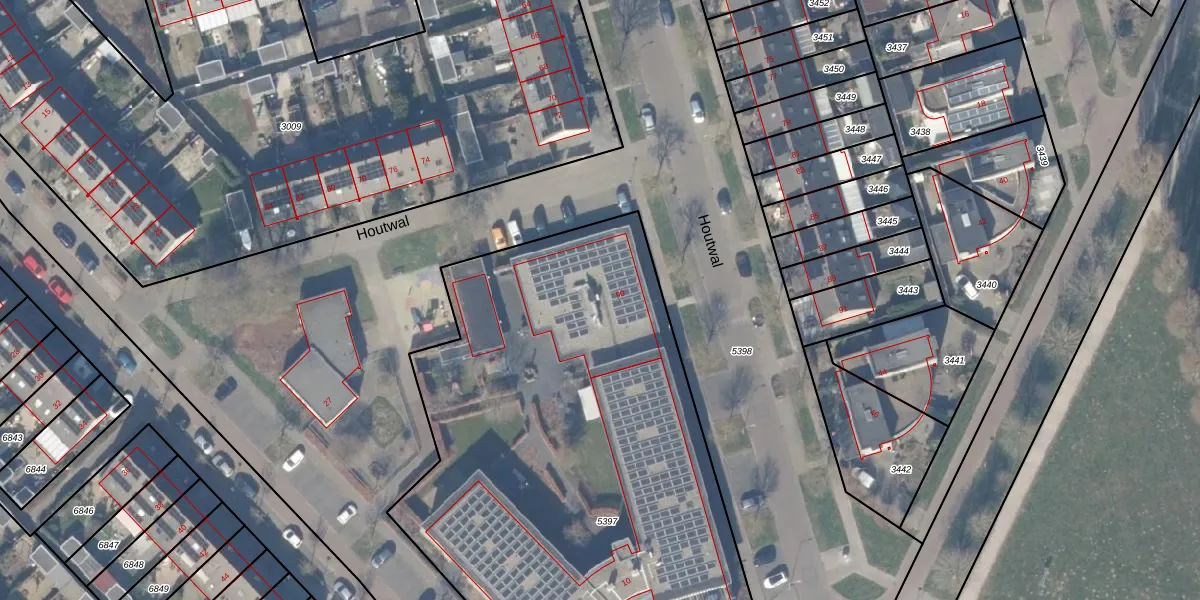 Het perceel waarop Houtwal 90 staat heeft een oppervlakte van 3245 m². Dit is een zeer groot perceel. De perceeloppervlakte wordt geregistreerd door het Kadaster. Gedetailleerde informatie over de maten van dit perceel kunt u vinden in het rapport Kadastrale kaart met maatvoering van Houtwal 90.