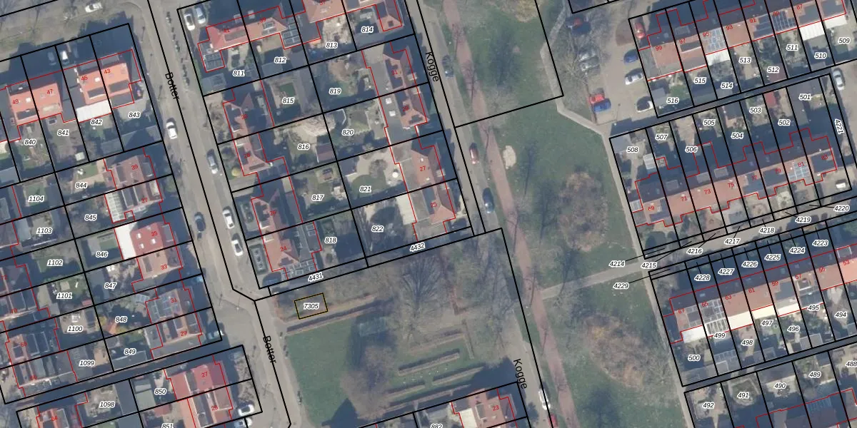 Het perceel waarop Kogge 25 staat heeft een oppervlakte van 303 m². Dit is een groot perceel. De perceeloppervlakte wordt geregistreerd door het Kadaster. Gedetailleerde informatie over de maten van dit perceel kunt u vinden in het rapport Kadastrale kaart met maatvoering van Kogge 25.