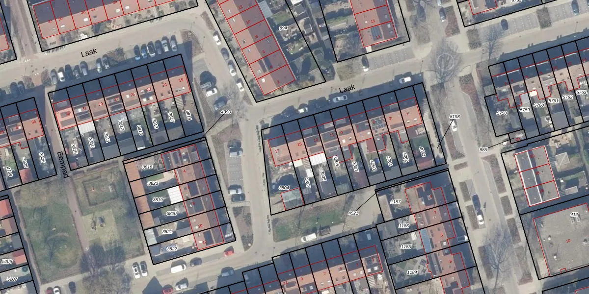 Het perceel waarop Laak 15 staat heeft een oppervlakte van 164 m². Dit is een middelgroot perceel. De perceeloppervlakte wordt geregistreerd door het Kadaster. Gedetailleerde informatie over de maten van dit perceel kunt u vinden in het rapport Kadastrale kaart met maatvoering van Laak 15.