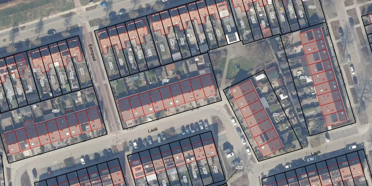 Het perceel waarop Laak 20 staat heeft een oppervlakte van 1494 m². Dit is een zeer groot perceel. De perceeloppervlakte wordt geregistreerd door het Kadaster. Gedetailleerde informatie over de maten van dit perceel kunt u vinden in het rapport Kadastrale kaart met maatvoering van Laak 20.