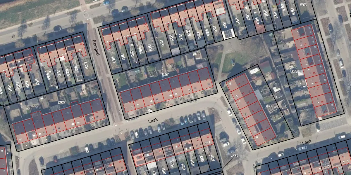 Het perceel waarop Laak 22 staat heeft een oppervlakte van 1494 m². Dit is een zeer groot perceel. De perceeloppervlakte wordt geregistreerd door het Kadaster. Gedetailleerde informatie over de maten van dit perceel kunt u vinden in het rapport Kadastrale kaart met maatvoering van Laak 22.