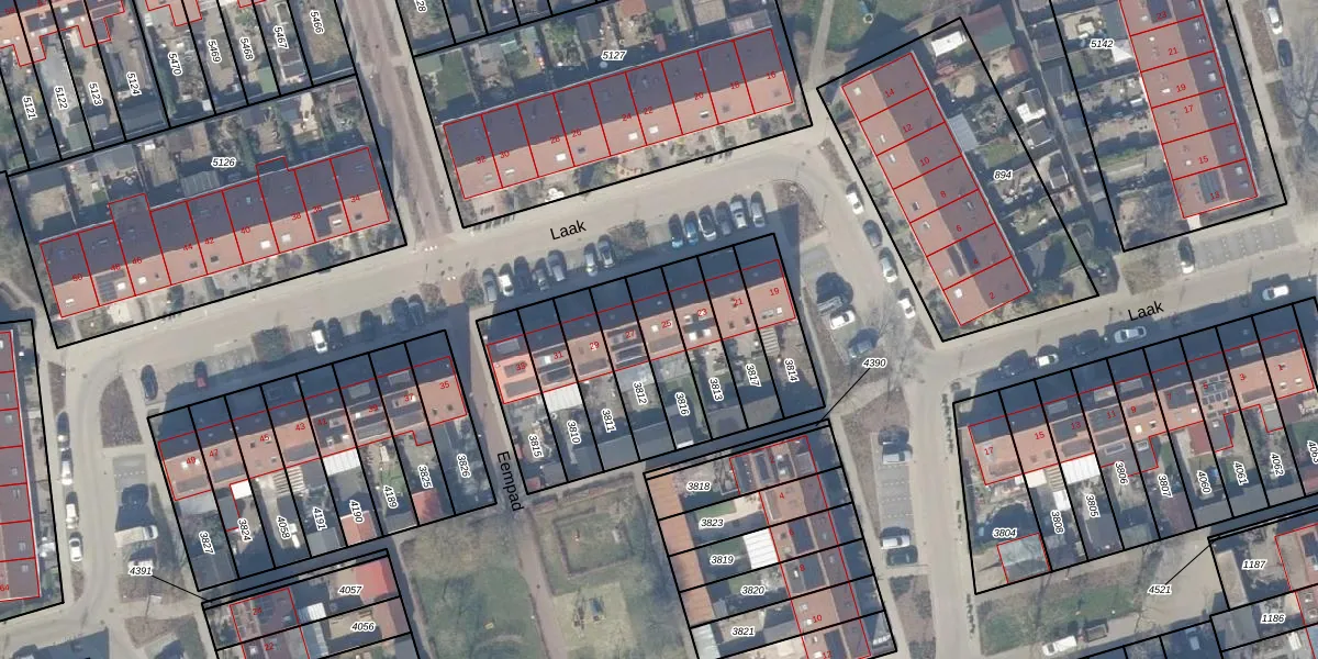 Het perceel waarop Laak 25 staat heeft een oppervlakte van 156 m². Dit is een middelgroot perceel. De perceeloppervlakte wordt geregistreerd door het Kadaster. Gedetailleerde informatie over de maten van dit perceel kunt u vinden in het rapport Kadastrale kaart met maatvoering van Laak 25.