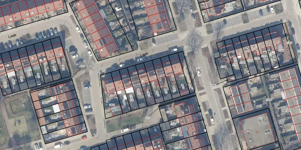 Het perceel waarop Laak 7 staat heeft een oppervlakte van 166 m². Dit is een middelgroot perceel. De perceeloppervlakte wordt geregistreerd door het Kadaster. Gedetailleerde informatie over de maten van dit perceel kunt u vinden in het rapport Kadastrale kaart met maatvoering van Laak 7.