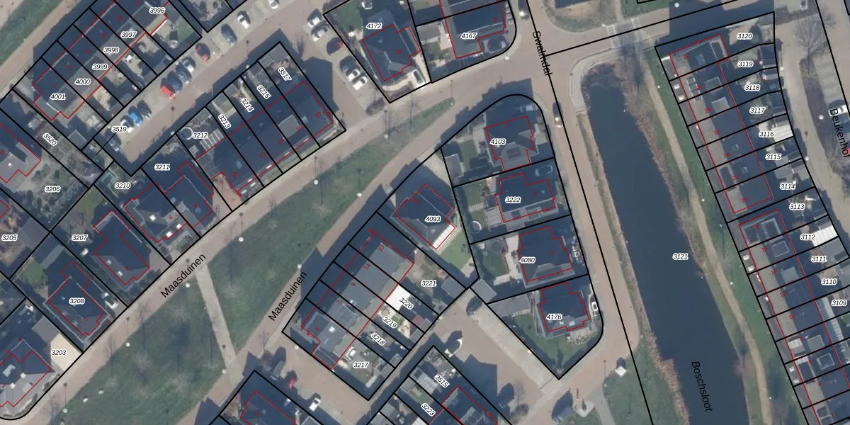 Het perceel waarop Maasduinen 15 staat heeft een oppervlakte van 362 m². Dit is een groot perceel. De perceeloppervlakte wordt geregistreerd door het Kadaster. Gedetailleerde informatie over de maten van dit perceel kunt u vinden in het rapport Kadastrale kaart met maatvoering van Maasduinen 15.