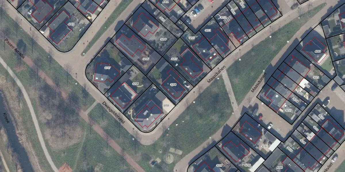 Het perceel waarop Maasduinen 2 staat heeft een oppervlakte van 373 m². Dit is een groot perceel. De perceeloppervlakte wordt geregistreerd door het Kadaster. Gedetailleerde informatie over de maten van dit perceel kunt u vinden in het rapport Kadastrale kaart met maatvoering van Maasduinen 2.