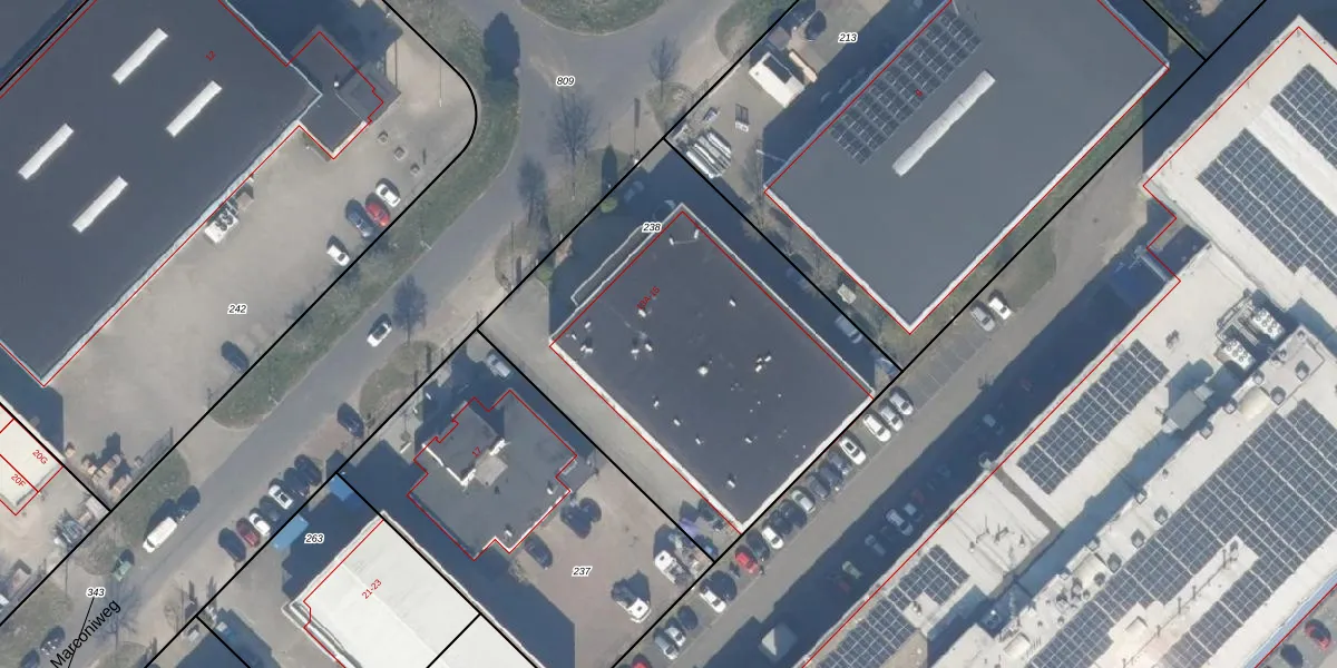 Het perceel waarop Marconiweg 15 staat heeft een oppervlakte van 2001 m². Dit is een zeer groot perceel. De perceeloppervlakte wordt geregistreerd door het Kadaster. Gedetailleerde informatie over de maten van dit perceel kunt u vinden in het rapport Kadastrale kaart met maatvoering van Marconiweg 15.