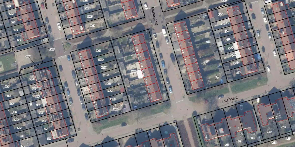 Het perceel waarop Middelplaat 7 staat heeft een oppervlakte van 1341 m². Dit is een zeer groot perceel. De perceeloppervlakte wordt geregistreerd door het Kadaster. Gedetailleerde informatie over de maten van dit perceel kunt u vinden in het rapport Kadastrale kaart met maatvoering van Middelplaat 7.